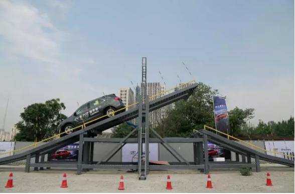 缓缓通过滚轴坡道驶上在下面看得都有些心惊的高空跷板驼峰桥,当前轮在滚轴上,猛踩油门,智能四驱进行扭矩分配,而探界者2.0T发动机带来的353Nm最大扭矩,同级最高扭重比,强势爬上高坡。过坡成功后,按下HDC按钮下坡,放开刹车,陡降缓坡系统安全且简便的自动缓行下坡。不得不为探界者四驱系统与强劲动力搭配带来的强悍点赞!
